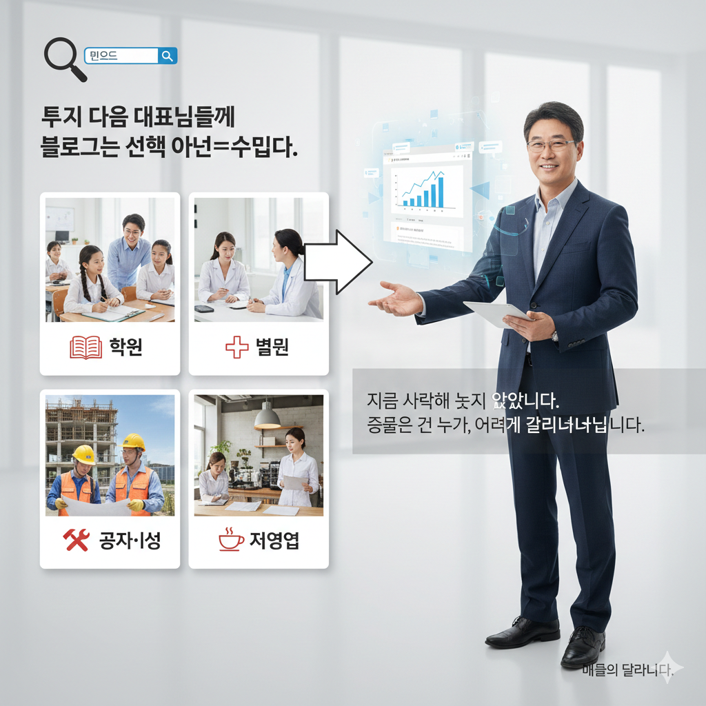 특히 학원, 병원, 공사·시공, 자영업, 중소기업 대표님들께 블로그는 선택이 아닌 필수입니다.